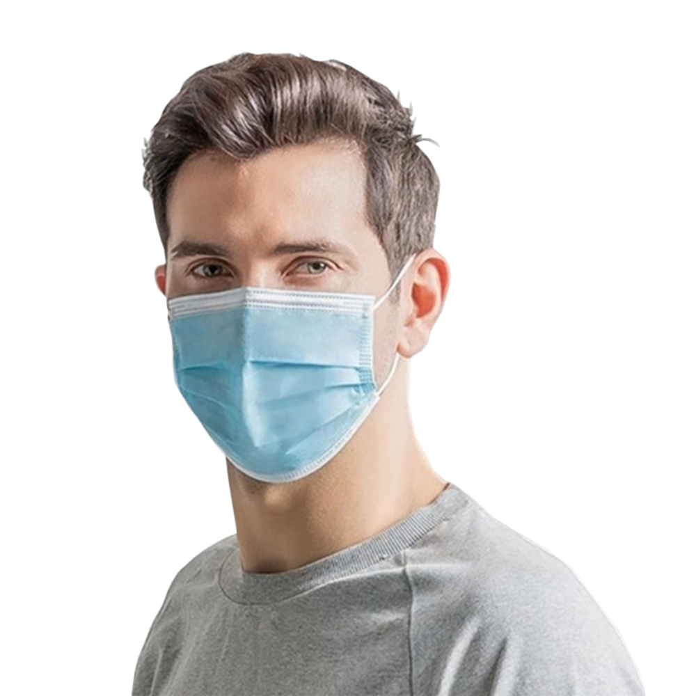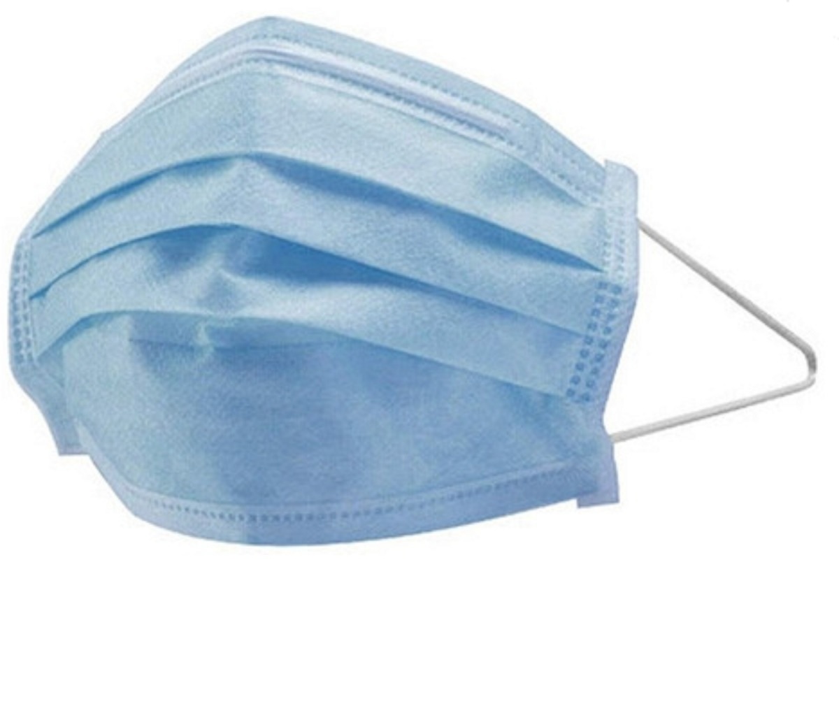 Barbijo rectangular tableado tricapa, descartable, con ajuste nasal y elástico.