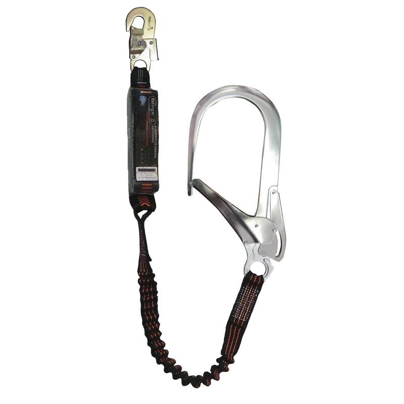 Cabo de vida anticaídas de 1,5 metros en cinta elastizada, con amortiguador y mosquetón de 18mm y 110mm de abertura.