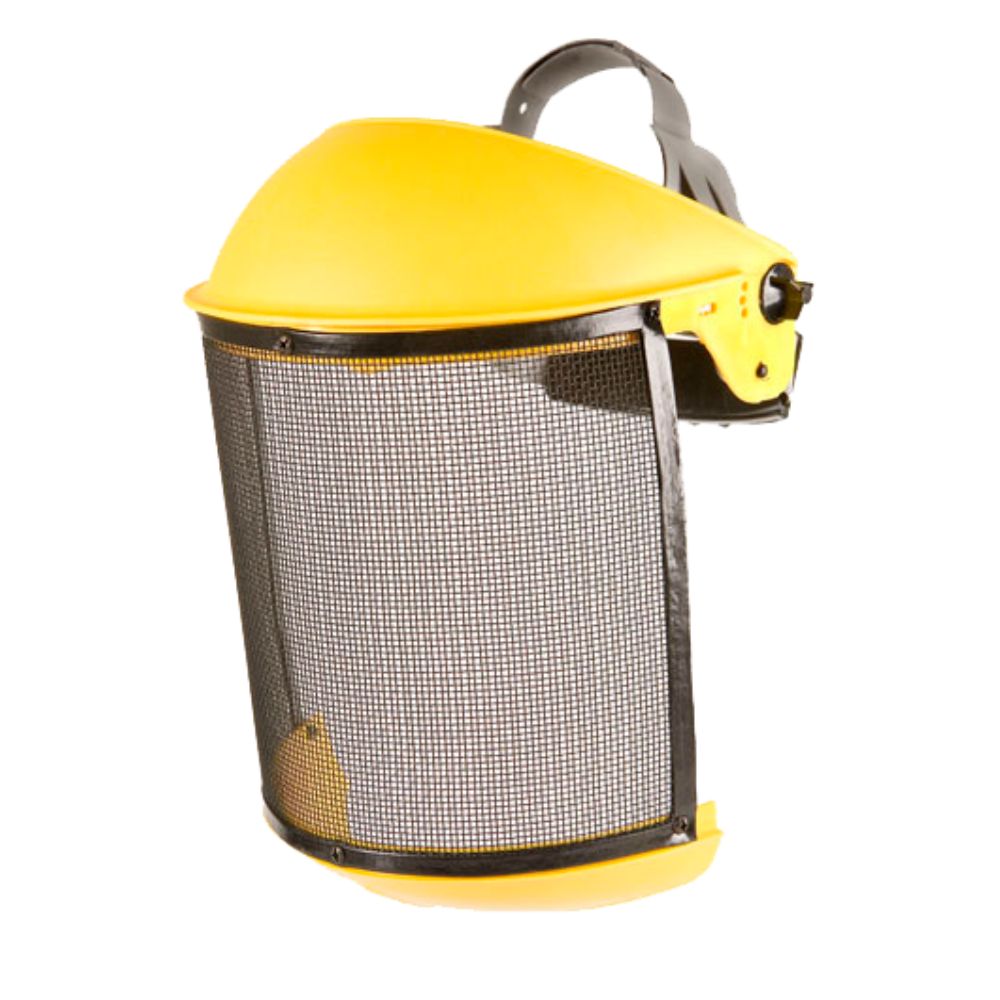 Protector facial que cubre todo el rostro con visor de malla de alambre tejido.